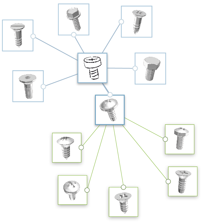 You start the search with an existing part, a sketch or a search term. The results of the search are graphically ordered in so called clouds, around the original component or the search term. Starting from these results, users can further refine their search and in the course of the multi-layered search process they always see the complete search history at a glance.